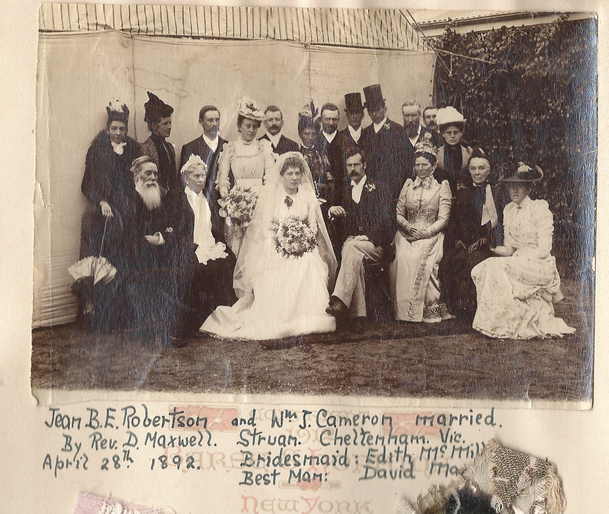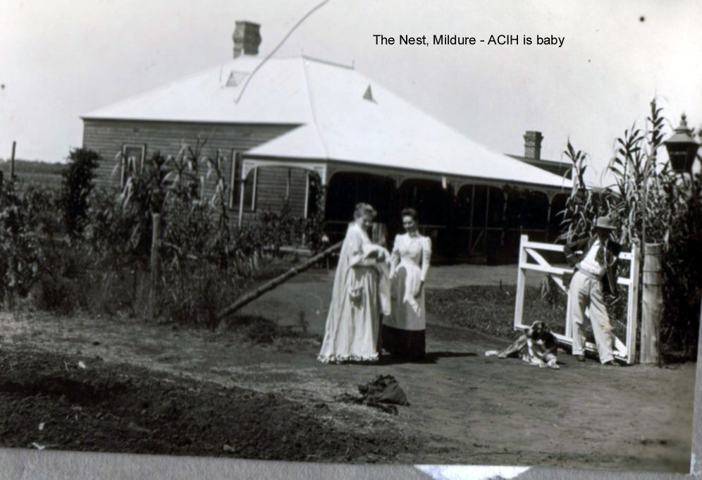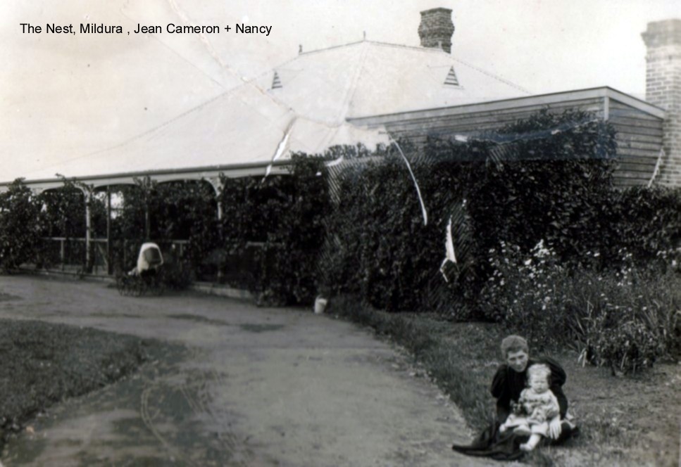 Isabella CameronJohn CameronThe Cameron children, circa 1874, William leftmost. The Cameron Family and servants, posed in front of Cullalo, 1885, William leftmost.William, circa 1885Annie Irvine Robertson with Lily circa 1863Alexander Robertson with Johnnie circa 1863Jeannie Robertson circa 1891William Cameron circa 1891David Maxwell, Edie McMillan, Jeannie and William on their wedding dayThe Nest, Mildura, 1892, with Jeannie and Olga by the gate.Jeannie, Bert, John, William and Olga at The Nest, 1894The Nest, December 1893, with Annie holding Nancy, a nursemaid, and John leaning on the gateRear view of The Nest, circa 1895, with William holding NancyThe Nest, circa 1895, with Jeannie holding NancyBert, circa 1898Jeannie, circa 1898William, circa 1900Jeannie, Annie and Nancy, at the Nest, 1903, hand-coloured. Photo from Jeannie’s ‘Open Door’ guest book.