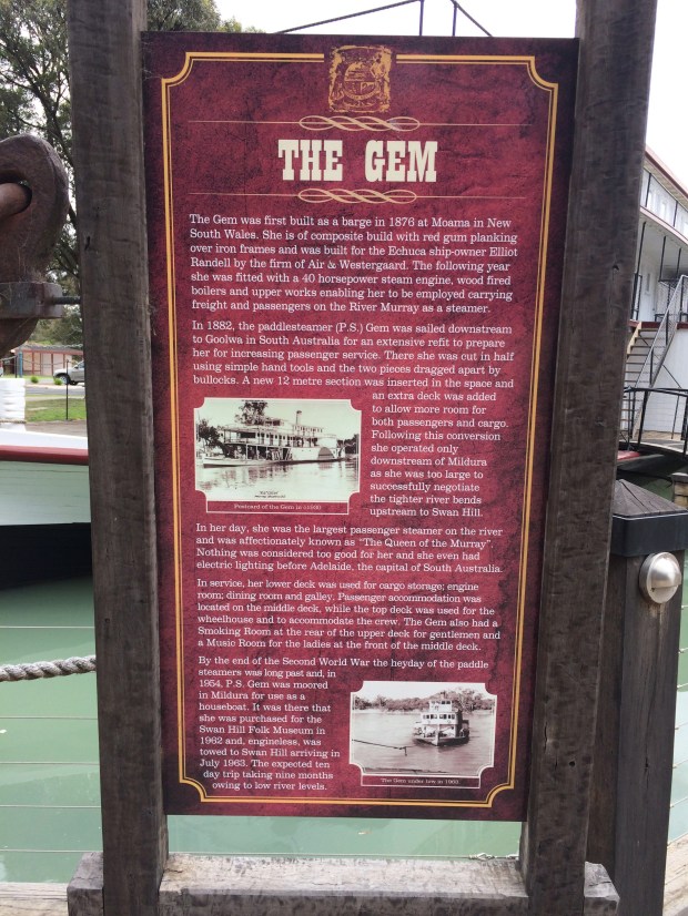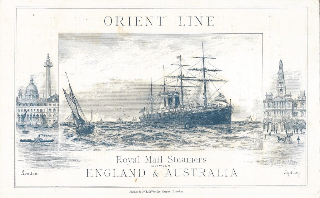 R.M.S. Iberia – Annie, Lily and Jeannie’s voyage in 1883.Waimea (ex-Dorette) – William’s voyage to NZ in 1885, Photographer Alan C. Green, State Library of Victoria (Accession No. H91.250/624)R.M.S. Orient – William’s boarding postcard, 1888From the Orient Guide, 1888, Edited for the managers of the Line by W.J. LoftieANMM Collection Transfer from the Australian War Memorial, ANMS0599[521]S.W. Pearl, circa 1892, State Library of South Australia, [PRG 1258/1/2955]P.S. Ruby, circa 1895, State Library of South Australia, [PRG 1258/1/3294]The Gem, now at Swan Hill Folk Museum Photos by Brenda Hall, 2017